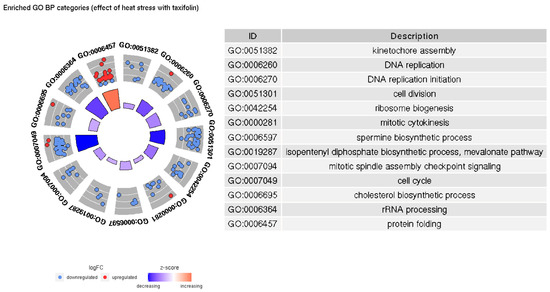 Although not present among the significantly enriched GO terms, a number of processes and protein families are known to be affected by either taxifolin or heat stress. Among the latter, heat shock proteins are the most obvious group of interest. It is also important to note that besides its direct effects in protein folding, the HSP70 family also plays a role in downregulating the expression of pro-inflammatory genes [60,61], so any effect that taxifolin has on inflammation may be (at least partly) mediated by HSP70 activation.