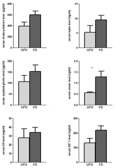 Effects of fermented feedstuff (FFS) on serum hormones associated with food intake and growth in weaned piglets. The serum levels of cholecystokinin (CCK), leptin, IGF-1, and GH were measured by commercially available ELISA kits (Shanghai Enzyme-linked Biotechnology Co., Ltd. Shanghai, China). Orexin A was quantified by a commercially available ghrelin EIA kit (Phoenix Pharmaceuticals, Inc., CA, USA, intra-assay CV < 10%, inter-assay CV < 15%, sensitivity is 0.2 ng/mL). Acylated ghrelin was measured by a commercially available ELISA kit (Bertin Pharma, Montigny-le-Bretonneux, France; A05401, intra-assay CV < 7.3%, inter-assay CV < 16.4%, sensitivity is 3.3 pg/mL). The results are shown as mean ± S.E.M. UFD: unfermented feed group; FD: fermented group. Bars with one star denote a significant difference (p < 0.05).