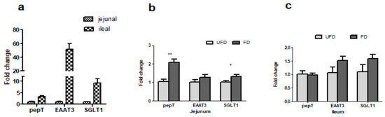 As shown in Figure 2a, the genes of excitatory amino acid transporter 3 (EAAT3), sodium–glucose linked transporter1 (SGLT1), and peptide transporter1 (PepT1) were all expressed in the ileum and jejunum of pigs, but these genes were more highly expressed in the ileum than in the jejunum when calculated in terms of relative expression (2ΔΔCt method). Their abundances in the ileum were approximately 50-, 9-, and 3-fold higher than in the jejunum, respectively. The statistical results showed that, compared with the UFD group, the FD group had significantly increased relative expression of SGLT1 and PepT1 in the jejunum (p < 0.05, Figure 2b), but not in the ileum (p > 0.05, Figure 2c). However, there were no significant differences in the relative expressions of the gene EAAT3 between the UFD and FD groups in either the ileum or the jejunum (p > 0.05).