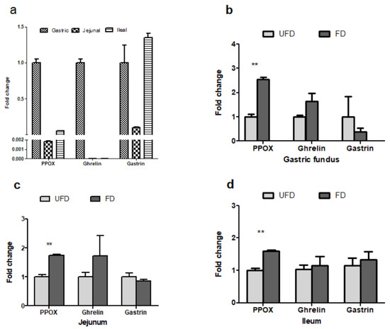 Relative gene expression of PPOX, ghrelin, and gastrin in porcine gastric fundus, jejunum, and ileum mucosa (a) and effects of fermented feedstuff (FFS) on the expression of the three genes in the gastric fundus (b), jejunum (c), and ileum (d) of weaned piglets. The mRNA expression was measured by real-time PCR with 5 mg of total mRNA. Glyceraldehyde 3-phosphate dehydrogenase (GAPDH) and tyrosine 3-monooxygenase/tryptophan 5-monooxygenase activation protein zeta polypeptide (YWHAZ) were used as reference genes, and the geometric mean of their Ct value was used as an internal control. The results of the feed change are shown as mean ± S.E.M. UFD: unfermented feed group; FD: fermented group. Bars with two stars denote a significant difference (p < 0.01).