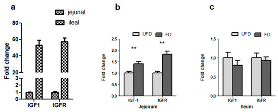 As shown in Figure 4a, the genes of IGF1 and IGFR were more highly expressed in the ileum than those in the jejunum when calculated in terms of relative expression (2ΔΔCt method). Their abundances were approximately 50-fold higher in the ileum than in the jejunum. The statistical results showed that, compared with the UFD group, the FD group had significantly higher IGF1 and IGFR gene expression in the jejunum of pigs (p < 0.01, Figure 4b) but not in the ileum (p > 0.05, Figure 4c).