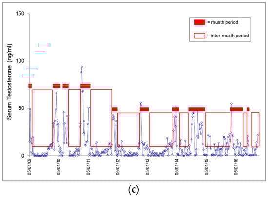 Patterns of testosterone during musth. (a) Male1: profile shows two annual musth cycles, with the first musth cycle split into two time periods occurring within the time frame of the second musth cycle; (b) Male2: profile shows declines in peak testosterone concentrations during musth with advancing age; (c) Male2: profile shows a greater percentage of time with increased testosterone during inter-musth periods from 2014 to end of life.