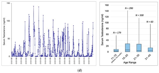 Elephants were trained for voluntary blood collection (without sedation) as part of routine management. Blood was collected (3–9 mL) in red-top serum separator tubes from an ear or leg vein by elephant care staff. Blood was maintained at approximately −4 °C, and then within a few hours it was centrifuged at 1500× g to separate serum and stored at −20 °C or colder until analysis. Samples were collected weekly, and in the morning to control for diurnal patterns of hormone secretion [45]. Serum testosterone was measured weekly for routine management starting in 2006. Prior to 2006, serum testosterone was measured as part of research projects [5,12,13,16,46]. Serum cortisol was measured in all stored samples for this research project and all samples were processed over a period of 3 months in 2017.