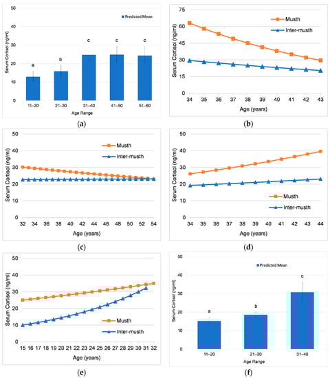 There was an overall increase in mean serum cortisol concentrations with age in all bulls combined. Across bulls, mean cortisol concentrations were lowest in the 11–20-year age category, higher in ages 21–30 years, and highest in ages 31–60 years (Figure 4a). The change in cortisol over time varied within individuals; two bulls (Male3 and Male4) exhibited an increase in cortisol over time, one (Male1) exhibited a decrease, and in one (Male2), there was no significant change with increasing age (Table 11).