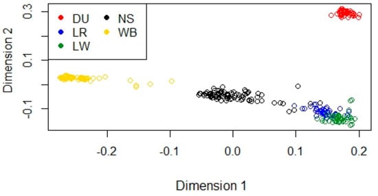 - Dimauro, C.; Cellesi, M.; Steri, R.; Gaspa, G.; Sorbolini, S.; Stella, A.; Macciotta, N.P.P. Use of the canonical discriminant analysis to select SNP markers for bovine breed assignment and traceability purposes. Anim. Genet. 2013, 44, 377–382. [Google Scholar] [CrossRef]