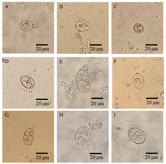 Morphological examination of sporulated oocysts of nine Eimeria species identified in goats in the present study. (A–I) Sporulated oocysts of E. ninakohlyakimovae, E. hirci, E. alijevi, E. jolchijevi, E. christenseni, E. arloingi, E. caprina, E. caprovina, and E. apsheronica, respectively.
