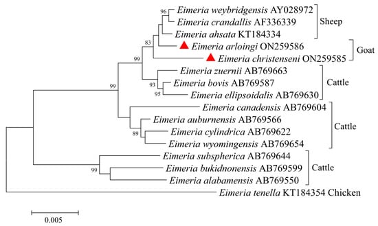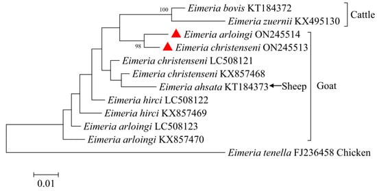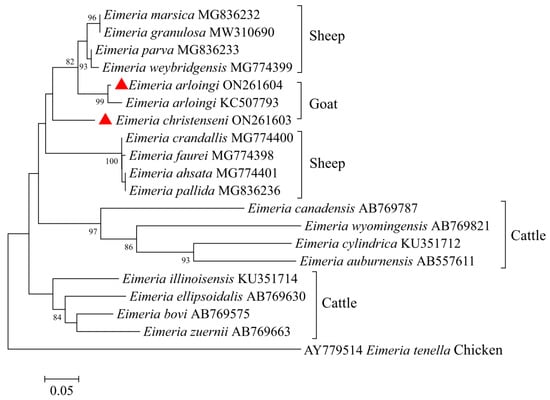 Phylogenetic tree generated by the Neighbor-Joining method using partial sequences of the 18S rDNA region of E. christenseni and E. arloingi from the present study and representative sequences of other Eimeria species available in GenBank. The sequences obtained in this study are marked with red triangles (bootstrap values below 75% are not indicated).