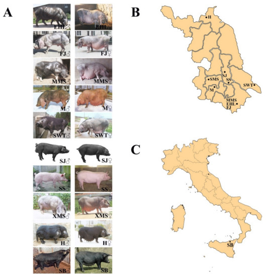 The photos of the ten native pig populations and geographical distribution. (A) The photos of the ten native pig populations; (B) geographical distribution of nine Jiangsu native pig population in Jiangsu province; (C) geographical distribution of Italic native pig breed in Italy. EHL, Erhualian; FJ, Fengjing; MMS, Middle Meishan; M, Mi; SWT, Shawutou; SJ, Sujiang; SS, Sushan; SMS, Small meishan; H, Huai; SB, Sicilian black pig; LW, Large White; DRC, Duroc.