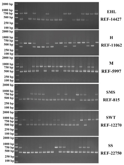 Retrotransposons are one class of transposable elements (TE) that can move freely in the genome via “copy-and-paste” mechanisms and induce allelic diversity [9,10]. One-half to one-third mammalian genome is derived from transposable elements and retrotransposons are the most common types of TE [11]. Therefore, retrotransposons lead to rich genetic diversity in many different species and contribute to genome evolution. Accordingly, several molecular markers based on the polymorphism of retrotransposon insertion patterns were developed, including SSAP (sequence-specific amplification polymorphism), IRAP (inter-retrotransposon amplified polymorphism), REMAP (retrotransposon-microsatellite amplified polymorphism), and RIP markers [12,13]. As one type of these molecular markers, RIP markers have been used in several species including humans [14] and dogs [15], among others. One type of retrotransposon, short interspersed nuclear elements (SINEs), is dispersed throughout eukaryotic genomes and can be used for diagnosing common ancestry among host taxa due to their enormous volume and the irreversible, independent nature of their insertion [16]. SINEs range in size from 150 to 500 bp and are widely dispersed among the chromosomes including gene-rich regions [17,18]. They lack the machinery that is necessary for self-mobilization and use the enzymatic machinery of autonomous retrotransposons (LINEs [long interspersed nuclear elements]) [17,19]. The RIPs which are based on SINE, also named SINE-RIPs, are suitable for determining genetic diversity and variety differentiation in plants [20,21,22]. Additionally, SINE insertion polymorphisms have been applied extensively for human population genetic analysis [23].