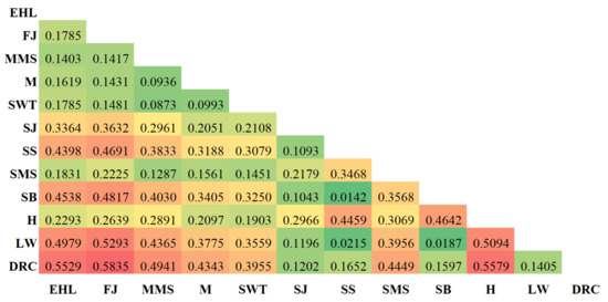Heatmap of the fixation indices (Fst) between 12 pig population including seven Jiangsu pig population. The color from red to green indicted that the FST value was decreased. EHL, Erhualian; FJ, Fengjing; MMS, Middle Meishan; M, Mi; SWT, Shawutou; SJ, Sujiang; SS, Sushan; SMS, Small meishan; H, Huai; SB, Sicilian black pig; LW, Large White; DRC, Duroc.