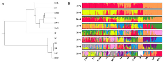 UPGMA tree on Nei’s genetic distances and graphical representation with K 2–9. (A) UPGMA tree constructing by Mega7; (B) graphical representation with K 2–9 by STRUCTURE software. Different color showed different origination. EHL, Erhualian; FJ, Fengjing; MMS, Middle Meishan; M, Mi; SWT, Shawutou; SJ, Sujiang; SS, Sushan; SMS, Small meishan; H, Huai; SB, Sicilian black pig; LW, Large White; DRC, Duroc.