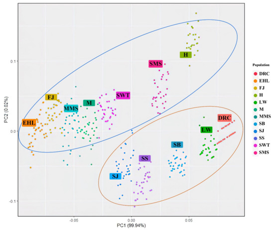 The principal components classified the Jiangsu native pig populations and the other five breeds into two different groups (Figure 5). In addition, Huai was differentiated from the other six Jiangsu native pig populations. These data agreed with the NJ tree and population structure data described above.