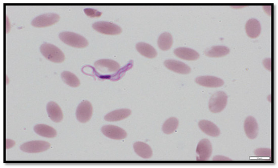 Trypanosoma evansi under a microscope (Olympus BX53, Tokyo, Japan).