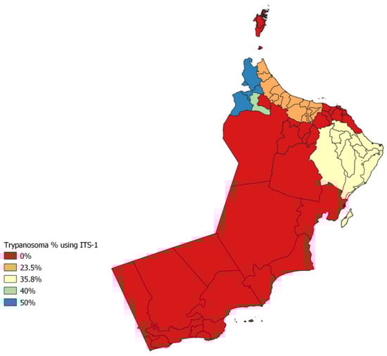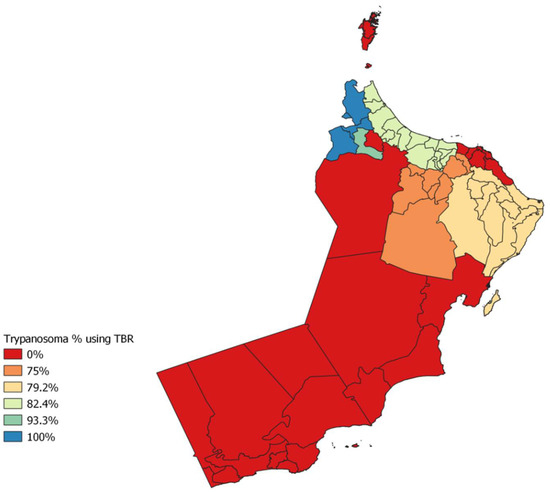 The prevalence of trypanosome species using TBR PCR was higher in Al Buraimi, followed by Al Dhahirah and Al Batinah. The overall prevalence was 77% in five governorates and was higher than the overall prevalence of trypanosoma species found using TBR in Pakistan: 31.9% [8] and 22% [37].