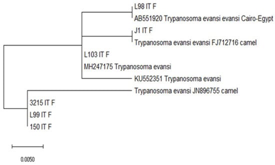 Thirty Trypanosoma-positive samples were sequenced with a yield of only six. Four haplotypes were identified. One trypanosome-positive sample (GenBank: MH247175) sequenced shared 100% identity with T. evansi. A trypanosome-positive sample (GenBank: AB551920) sequenced shared 100% identity with T. evansi evansi, one sequence shared 100% with T. evansi evansi and three samples were identical (GenBank: JN896755, KU552351), sharing 100% identity with T. evansi (Table 2). The strain that was detected in one sample (GenBank: AB551920) was the same as the one identified in Egypt. In addition, one haplotype (GenBank: FJ712716) was identical to the strain of T. evansi evansi found in camels in China [20]. Moreover, one dromedary camel sample had the same strain of T. evansi (GenBank: MH247175) that was identified in a Stomoxys calcitrans fly in Kenya [21]. Three camel samples had the same haplotypes; they were identical to strains detected in Iran (GenBank: JN896755) and were identical to a strain identified in blood samples of infected mice (GenBank: KU552351) [22,23].