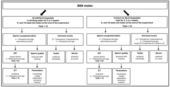During the experiments, all males were housed singly. For each of the two age groups, 9 or 16 weeks, 3 males were used for timepoint 0 (basal values) and 6 males (3 controls and 3 D-Asp-treated) were used for each timepoint (2 or 4 weeks). Therefore, a total of 30 males were used for sperm cryopreservation (Figure 1).