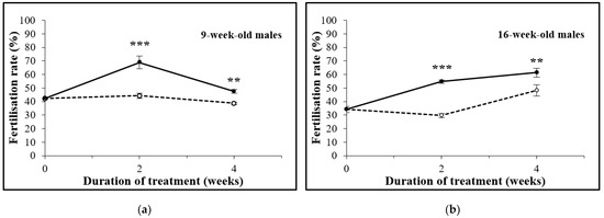 The in vitro fertilization rate with spermatozoa obtained from 9-week-old (a) and 16-week-old males (b) treated (continuous lines) or not treated (dotted lines) with D-Asp. Significant differences between D-Asp-treated males and controls are marked as follows: **: p < 0.01, ***: p < 0.001.