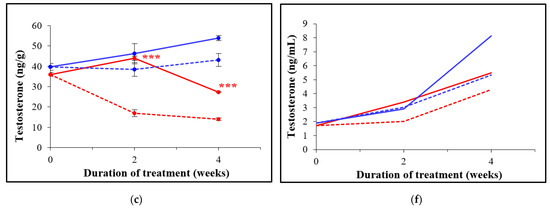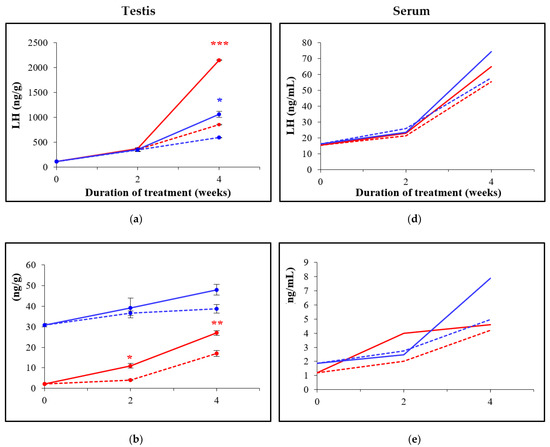 Hormone measurement in males treated with D-Asp (continuous lines) and control males (dotted lines) from 9-week-old (red lines) and 16-week-old males (blue lines) in testes (a–c) and in sera (d–f). With respect to the hormone levels in the testis, the results are the mean of three samples (n = 3) and are expressed as mean ± SEM. The hormone levels in serum were measured in triplicates using three samples that were previously pooled. Significant differences between D-Asp-treated and control 9-week-old males are marked with red asterisks as follows: *: p < 0.05, **: p < 0.01, ***: p < 0.001, whereas in D-Asp-treated and control 16-week-old males, this is marked with a blue asterisk as follows: *: p < 0.05.