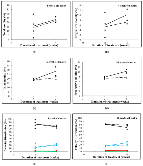 Total motility, progressive motility, and velocity distribution (rapid: blue lines; medium: red lines; slow: green lines; and static: black lines) of spermatozoa from 9-week-old (a,b,e) and 16-week-old males (c,d,f) treated (continuous lines, single values are shown in solid circles) or not treated (dotted lines, single values are shown in open circles) with D-Asp. The results are shown as the mean of two straws measured in duplicate each.