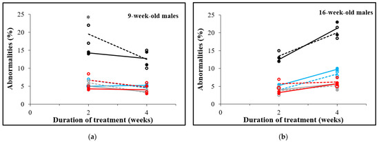 Abnormalities (total: black lines; head: blue lines; tail: gray lines; and cytoplasmic droplet: red lines) of spermatozoa from males treated (continuous lines, single values are shown in solid circles) or not treated (dotted lines, single values are shown in open circles) with D-Asp. Males were either 9 weeks old (a) or 16 weeks old (b). The results are shown as a mean of two replicates of 200 spermatozoa each. Significant differences between D-Asp-treated males and controls are marked as follows: *: p < 0.05.