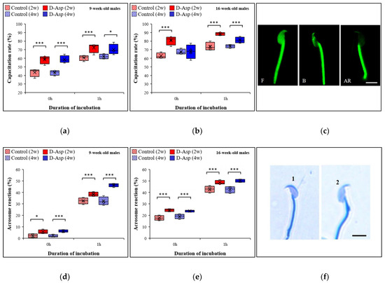 The capacitation rate of spermatozoa from control males and from males treated with D-Asp for 2 weeks or 4 weeks, which were either 9 weeks old (a) or 16 weeks old (b) at 0 h and 1 h. (c) Representative image of CTC staining: non-capacitated (F), capacitated (B), and acrosome-reacted (AR) spermatozoa. Scale bar = 3 µm. The acrosome reaction of spermatozoa from control males and from males treated with D-Asp for 2 weeks or 4 weeks at 0 h and 1 h. Males were either 9 weeks old (d) or 16 weeks old (e). (f) Representative image of Coomassie brilliant blue G-250 staining. (1) spermatozoa with acrosome, (2) spermatozoa without acrosome. Scale bar = 3 µm. Box-and-whiskers plot; data points: open circles, maximum: endpoint of upper whisker, minimum: endpoint of lower whisker, third quartile (75th percentile): upper edge of the box, first quartile (25th percentile): lower edge of the box, median (50th percentile): line inside the box, mean: X. Significant higher rates in D-Asp-treated males than in controls: *: p < 0.05, ***: p < 0.001.