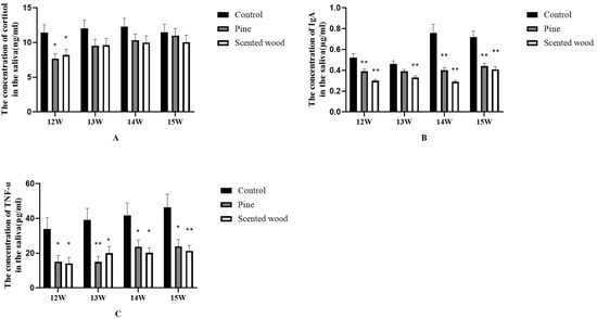3.4. Effect of Enrichment Items on Cortisol, IgA and TNF-α in Saliva