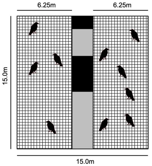 Schematic of the wire-mesh testing enclosures for both groups of birds. Black areas depict opaque barriers within the 2.5 m of separation between groups during testing.