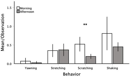 The following supporting information can be downloaded at: https://www.mdpi.com/article/10.3390/ani12111357/s1, Table S1: Random effects from the Generalized Linear Mixed Model; Figure S1: The temporal distribution of (a,b) yawning, (c,d) stretching, (e,f) scratching, and (g,h) shaking across the two 20-min morning and two 20-min afternoon observation periods, depicted within 5-min intervals; Figure S2: The distribution of Z-scores from the 60-s runs test analyses for (a) yawning, (b) stretching, (c) scratching, and (d) shaking across all morning (white) and afternoon (black) observations; Figure S3: The mean Z-scores from the 30- and 60-s runs test analyses between Group 1 and Group 2; Figure S4: The mean Z-scores from the 30- and 60-s runs test analyses between morning and afternoon observations.