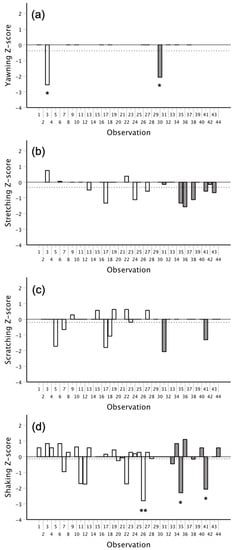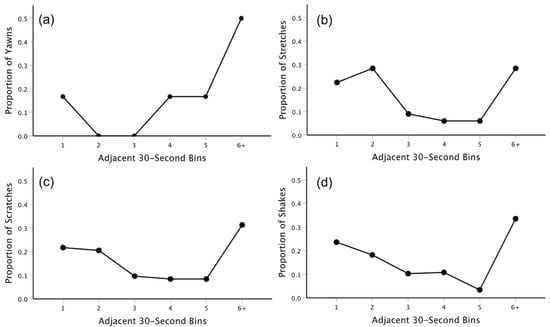 Next, patterns of contagion were more closely examined by investigating whether behavioral runs occurred with a greater frequency than would be expected by chance. Each 20 min observation was broken into forty 30 s bins, and the frequency of each behavior was determined in a similar fashion to Miller et al. [] and Massen et al. []. To identify non-random distributions across the 30 s intervals, separate runs tests were performed across all observations for each behavior using SPSS for Macintosh (Version 27.0, IBM Corp., Armonk, NY, USA). The generated Z-scores are normally distributed, with negative values indicating a greater degree of temporal clustering or clumping (i.e., patterns of both consecutive bins with and without a particular behavior), while positive values indicate a greater than expected level of dispersion. A total of 48 behavioral observations had to be removed due to a behavior being completely absent—spread across yawning (31), stretching (12), scratching (4), and shaking (1).
