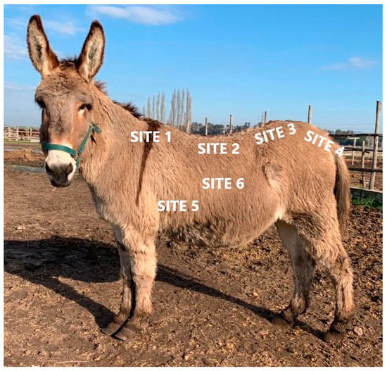 No significant difference has been detected during the observation of different sites through time, except for S2 and S6a: S2 at T2 and S6a at T1 were significatively different to values obtained at T5. For cows a significant effect of the time on the mean values of backfat thickness during the peripartum period was detected [27]: the values decreased gradually from 30 days before until 60 days after calving, as the peak of lactation approaches [27]. In jennies, the lactation curve is variable from 8 to 12 weeks post-partum. It usually presented 2 peaks, depending on the time of parturition: at 60 and 150 d in the summer group and a peak at 90 d in the spring group [28]. Approaching the peak of lactation might positively influence fat mobilization, since the first months of lactation led to difficulty in meeting the greater energy needs similarly to other dairy species [25,27]. In our study, differences were detected only in two sites probably because these are more susceptible to fat mobilization compared to others [12,13], which could be influenced since the earliest phase of lactation.