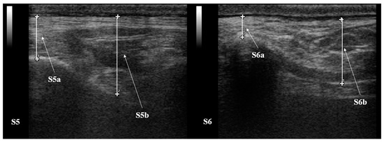 Measurements were performed offline by the same operator (IN), using a dedicated software (MyLab Desk, Esaote, Florence, Italy). For all the images obtained, the SF thickness was determined from subcutaneous fascia to proximal muscle fascia [11,24]. In particular, at S5, the SF was measured over the 6th rib (referred to on ultrasound image measurements as S5a) and between ribs 6–7 (referred to on ultrasound image measurement as S5b) (Figure 2); at S6, the SF was measured over the 13th rib (referred on ultrasound image measurements as S6a) and between ribs 12–13 (referred to on ultrasound image measurements as S6b), as shown in Figure 2. None of those measurements included skin thickness. For all SF evaluations, the average value of three consecutive measurements was considered, allowing us to overcome small variations of the SF, except for S5 and S6 [11].