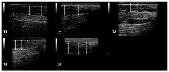 RTU image of S1 from the same healthy jenny, throughout the study period (T1, T2, T3, T4, T5). The SF thickness were determined from subcutaneous fascia to proximal muscle fascia and the average value of three consecutive measurements was considered (white lines), for each RTU image. The left side of the images is proximal, the right side is distal. B-mode, linear probe 7.5 MHz.
