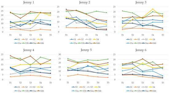 Individual jennies trends of RTU of SF, for each site (S1–S6b), throughout the study period (T1–T5). Legend: times (T1–T5) were reported on the x-axis, as follows: T1, 15 days before the presumptive parturition; T2, 7 days before the presumptive parturition; T3, 2 days after delivery; T4, 15 days after delivery; T5, 30 days after delivery. RTU of SF values was reported on the y-axis, in millimeters. Sites (S1–S6b) were reported as colored lines, as follows: S1, at the spine wither level; S2, at the spine, the 13th thoracic vertebra level; S3, cranial to the tuber sacralis, parallel to the spine; S4, anterior to the tail-head; S5 and S6, the probe was placed at the thoracic cage perpendicular to the ribs. In particular, for S5, the SF was measured over the 6th rib (referred to as S5a) and between ribs 6–7 (referred to as S5b), just caudal to the point of the elbow; at S6, the SF was measured over the 13th rib (referred to as S6a) and between ribs 12–13 (referred to as S6b).