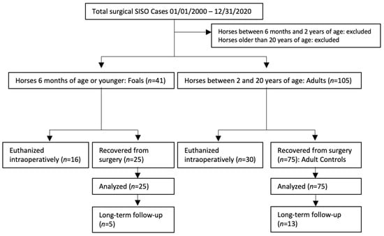 Hospital records from five institutions were reviewed to find surgical SISO cases. These records were obtained from North Carolina State University, University of California, Davis, Colorado State University, University of Pennsylvania and The Ohio State University. Horses were included if SISO was confirmed during laparotomy, with adults defined as horses between 2- and 20-years-of-age, and foals defined as 6-months-of-age or younger. Records were collected for both horses that were recovered from surgery and those that were euthanized intraoperatively, though the cases euthanized intraoperatively were analyzed separately. Three adult cases recovered from surgery were matched to each foal case that was recovered from surgery. Attempts were made to match adult cases to foals by institution, year of surgery, type and location of lesion, and whether a resection was performed, based on the medical records available at each referral hospital (Figure 1). Epiploic foramen entrapments were excluded from analysis due to previous research indicating a much poorer prognosis compared to other SISO lesions []. Types of lesions matched were approximate, as some cases present with lesions not seen in the other age group. For example, a foal was included with SI strangulation secondary to an ascarid impaction (an uncommon impaction etiology in adult horses) and was matched to adults that also had strangulated SI secondary to impactions of feed material. Foals and adults with SISO euthanized intraoperatively were excluded from survival analyses and therefore not case-matched, but were used to examine possible differences in intraoperative decision-making between foals and adults with SISO.