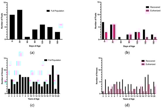 The population of foal cases collected was not normally distributed by age (p = 0.0002) (Figure 2a). The foal population appeared to have a right skew (mean = 67.34 days-of-age, median = 42 days-of-age), with younger foals presenting more frequently than older foals, particularly foals under 60-days-of-age (Figure 2a). When broken down by intraoperative decision, the population of foals euthanized during surgery was normally distributed (p = 0.07) (mean = 65.34 days of age, median = 40 days of age), with a trend toward intraoperative euthanasia of younger foals to achieve a more normal distribution from an originally right-skewed distribution (Figure 2b). Similar to the foal population, the adult population was not normally distributed (p < 0.0001) but is bimodal in appearance, with older and younger adult horses presenting more frequently than middle-aged horses (n = 20 horses between 17 and 18 years of age, n = 22 horses between 6 and 8 years of age) (Figure 2c). The distribution of adults euthanized during surgery was not normally distributed and followed the same bimodal appearance of the full population (p = 0.02) (Figure 2d).