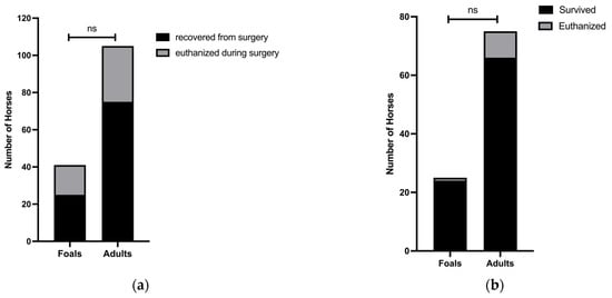 Similar proportions of foals and adults were euthanized intraoperatively, and short-term survival was higher in foals than adult case-controls. (a) Of 41 foals, 16 (39.0%) were euthanized intraoperatively, while 30 of 105 (28.6%) adults were euthanized intraoperatively. (b) Of 25 foals, 24 (96.0%) survived to hospital discharge, while only 66 of 75 (88.0%) adult case-controls survived to hospital discharge.