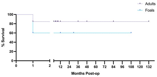 Long-term follow-up shows higher survival rates in adult case-controls. Of 13 adults and 5 foals, 2 adults and 2 foals were euthanized 1-month post-operatively for adhesions. Follow-up shows 84.62% survival in available adults, and 60% survival in available foals. The break in the x-axis spans time in which no horses died or were lost to follow-up. Tick marks on the survival curve indicate a horse that was lost to follow-up.