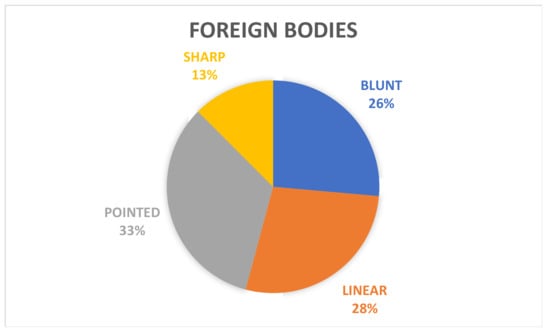 Moreover, the FBs were classified as sharp (13%, n = 9), pointed (33%, n = 24), blunt (26%, n = 19), or linear (28%, n = 20) (Figure 2).