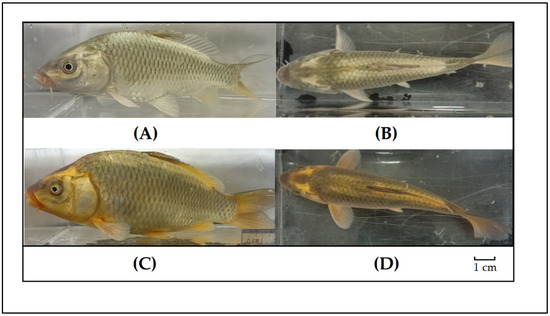 The traditional carp cultured for generations in the rice fields of Guizhou Province is known locally as golden-backed carp (Cyprinus carpio var. Jinbei) (tentative name) because of the two stable golden stripes on both sides of its dorsal fin and a pattern resembling a golden butterfly on its head (Figure 1). The golden-backed carp is mainly distributed in the rice fields of the border areas of Guizhou, Hunan and Guangxi Provinces in China. Long-term artificial and natural selection has made the golden-backed carp highly adapted to rice fields; for example, morphologically, these carp have a red tail with a phosphorus yellow pattern. In terms of living habits, they prefer to remain in rice fields and have a strong foraging ability. They are resistant to hypoxia and temperature differences of more than 20 degrees between day and night and can adapt well to the shallow water environment of rice fields. In recent years, Rice-fish farming has been widely promoted as an ecological farming method in Guizhou Province, where the area of Rice-fish farming reached 1867 × 105 hectares in 2020 [11], and neighbouring provinces. The golden-backed carp, as a very precious indigenous rice field fish germplasm resource in Guizhou, China, has attracted increasing attention.