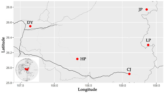 Through a survey, it was found that there are golden-backed carp in five regions of Guizhou Province, China. From August to October 2020, 75 golden-backed carp samples were collected from Jinping County (JP), Liping County (LP), Congjiang County (CJ), Huangping County (HP) and Duyun City (DY) in Guizhou Province (Figure 2). Fifteen individuals were collected at each sampling point (5 paddies were randomly selected from each sampling point, and 3 individuals were randomly selected from each paddy field), and the sampled fish had a body mass of 285.1–451.6 g and a body length of 15.51–22.81 cm.