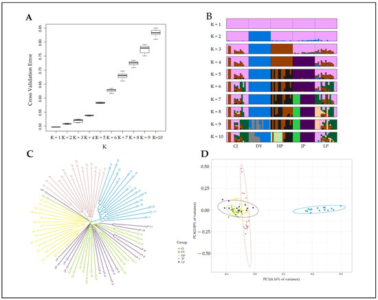 Genetic structure of five populations of golden-backed carp in Guizhou, China. CJ, DY, HP, JP and LP denote the Congjiang, Duyun, Huangping, Jinping and Liping populations, respectively. (A) A cross-validation error box plot. (The abscissa takes different K values, which indicate the number of hypothetical populations, while the ordinate represents the cross-validation error value. The cross-validation error of K values ranges from 1 to 10; generally, the lowest CV value is the optimal K value, but the results of other analyses need to be considered). (B) Based on the 5 populations of golden-backed carp, pong clustering was performed for multiple replicated results of each K value from 1 to 10 (each individual is represented by a single vertical line divided into K colours, where K is the number of clusters assumed, and different colours represent different populations. Black lines separate individual populations whose names are indicated below the diagram). (C) Neighbour-joining tree of 75 individuals in the 5 populations based on 44,896 SNPs. (D) Principal component analysis (PCA) was performed based on the degree of SNP differentiation in individual genes (PC1 and PC2 with the largest SNP variance were selected as the horizontal and vertical axes for PCA).