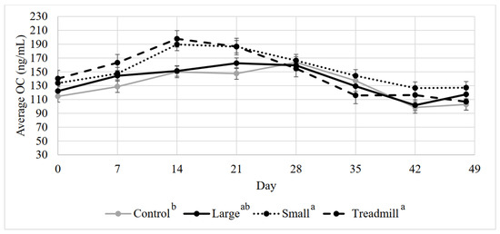 There was a significant effect of day and treatment on average OC concentration (Figure 1, p < 0.001 and p = 0.049, respectively), with the small circle and treadmill exercise groups having a greater osteocalcin concentration than the control group. Overall osteocalcin concentrations were higher on d 14 and 21. The interaction between day and treatment was not significant (p = 0.97).