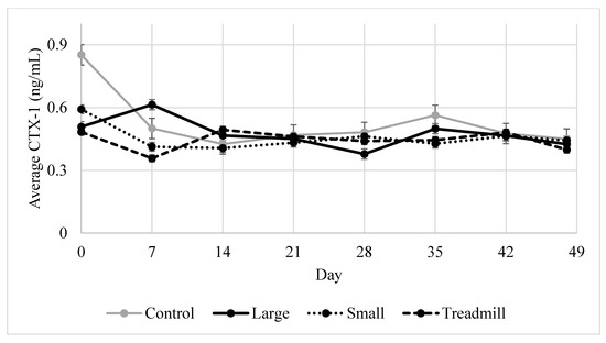 There was a significant effect of day on serum CTX-1 concentration (Figure 2, p = 0.02) but not treatment (p = 0.15). Day 0 had a greater average concentration of CTX-1 than other dates. The interaction between day and treatment was not significant (p = 0.42).