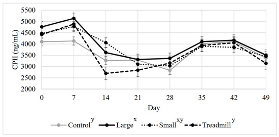There was a trend for a treatment effect on serum CPII concentration (p = 0.08) and a day effect (p < 0.0001), with day 14, 21, 28, and 49 having lower concentrations than other days (Figure 3). The interaction between day and treatment was not significant (p = 0.73).