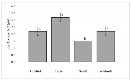 Log transformed average nitric oxide (NO) concentration in the lateral and medial fetlock joints by treatment. a, b Treatments that lack common superscripts differ (p = 0.0005).