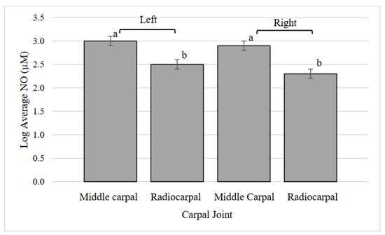 Log transformed average nitric oxide (NO) concentration in the middle carpal and radiocarpal joints. a, b Values that lack common superscripts differ (p < 0.0001).