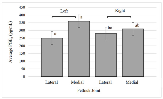 Average prostaglandin E2 (PGE2) concentration in lateral and medial fetlock joints. a,b,c Values that lack common superscripts differ (p = 0.0004).