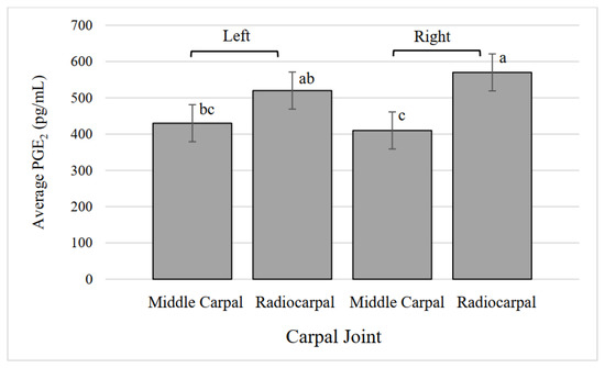 Average prostaglandin E2 (PGE2) concentration in middle carpal and radiocarpal joints. a,b,c Values that lack common superscripts differ (p = 0.007).