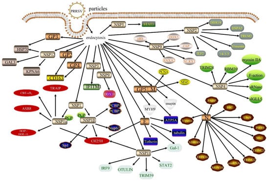 The PRRSV genome is 15 kb in length and contains 10 open reading frames (ORFs), with ORF1a, ORF1b, ORF2a, ORF2b, ORF3, ORF4, ORF5, ORF5a, ORF6, and ORF7 from the 5′ end to the 3′ end, respectively. Each ORF partially overlaps with its adjacent ORF. ORF1a and ORF1b mainly encode viral replicases, accounting for approximately 80% of the viral genome. ORF2-5 encode the proteins GP2a, GP2b, GP3, GP4, GP5, and GP5a, respectively; ORF6 encodes the matrix protein (M); and ORF7 encodes the viral nucleocapsid protein (N) [10]. ORF1, encoding a replicase, can be further hydrolyzed into 16 nonstructural proteins (NSP1α, NSP1β, NSP2-6, NSP-2N, NSP-2TF, NSP7α, NSP7β, and NSP8-12) [11]. This review focuses on recent advances to understand the interactions between PRRSV proteins and host cellular factors (Figure 1), which can lay the foundation for finding new antiviral targets and exploring the mechanism of viral replication.