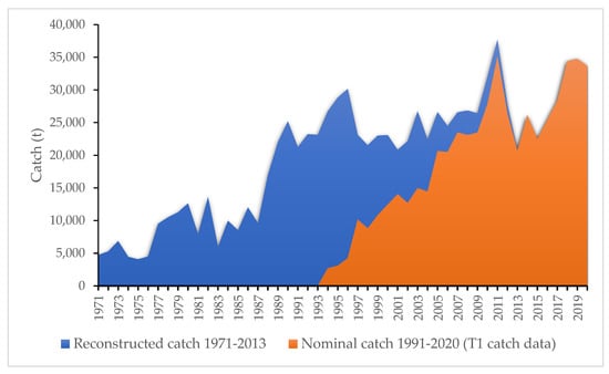 Historical reconstructed catches and nominal catch (T1NC) for the South Atlantic blue shark population. Catch reconstructed from 1971 to 2013; total used catch from 1971 to 2020. Nominal reported catch (T1NC) data from 1991 to 2020.
